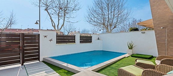 Terrassen er utstyrt med dusj, forhåndsinstallasjon for jacuzzi, utekjøkken, pergola for skygge og en praktisk bod. Utenfor stuen og kjøkken, et privat basseng på 3,5x5,5m med varmepumpe, som gir mulighet for helårsbruk.