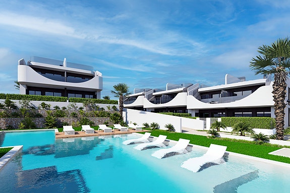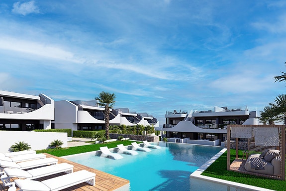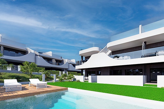 Boligkomplekset har et vakkert felles svømmebasseng omgitt av grønne områder – perfekt for å nyte det milde middelhavsklimaet.