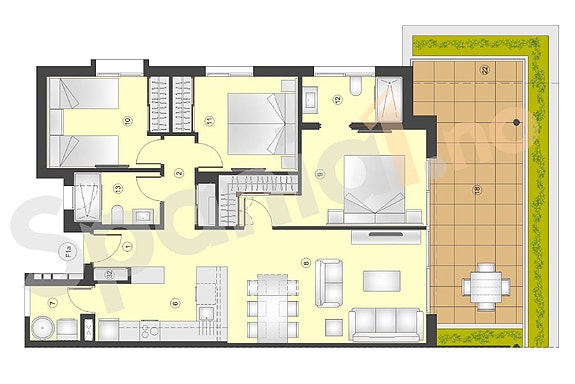 Rekkehus og eneboliger: 3 soverom med 3 bad, med store hager og muligheten for privat basseng.Fellesområdene er på mer enn 15 200 kvadratmeter inkluderer to store voksenbassenger, to barnebassenger og to oppvarmede jacuzzier. Barn kan nyte lekeområdet, mens petanque-entusiaster har egne baner. Urbaniseringen gir en følelse av naturlig miljø med kunstige innsjøer, skyggefulle områder, grøntområder med palmer og blomster, samt benker og stier for avslappende turer. Vannet og de grønne områdene gir en rolig atmosfære.