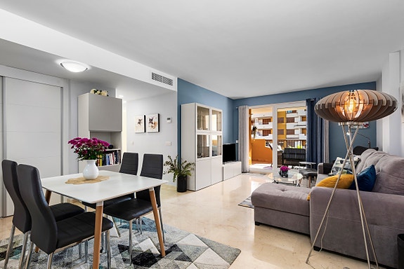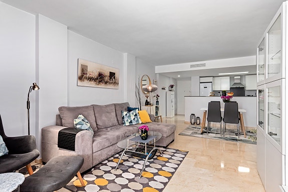 Leiligheten selges blant annet med air condition, hvitevarer og smakfulle møbler inkludert i prisen - blant annet en sovesofa i stuen.