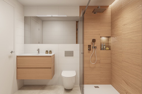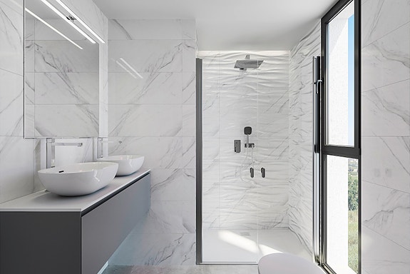 - Bad med vegghengte servanter, dusjnisje og glassvegg