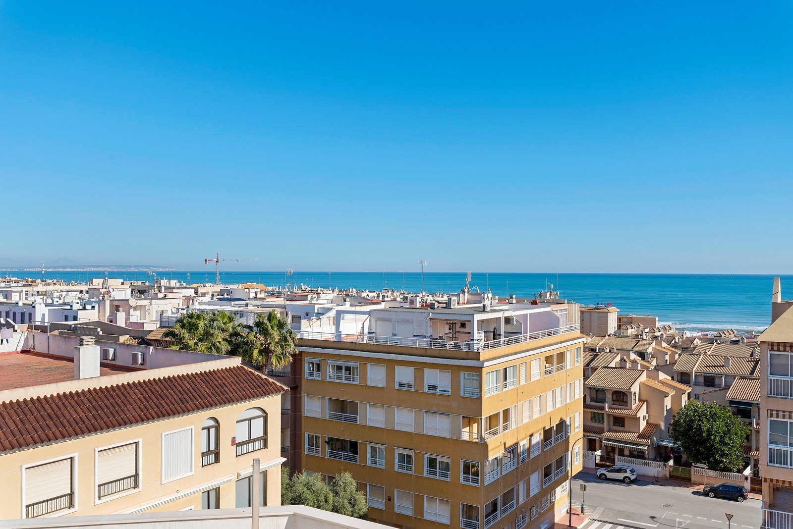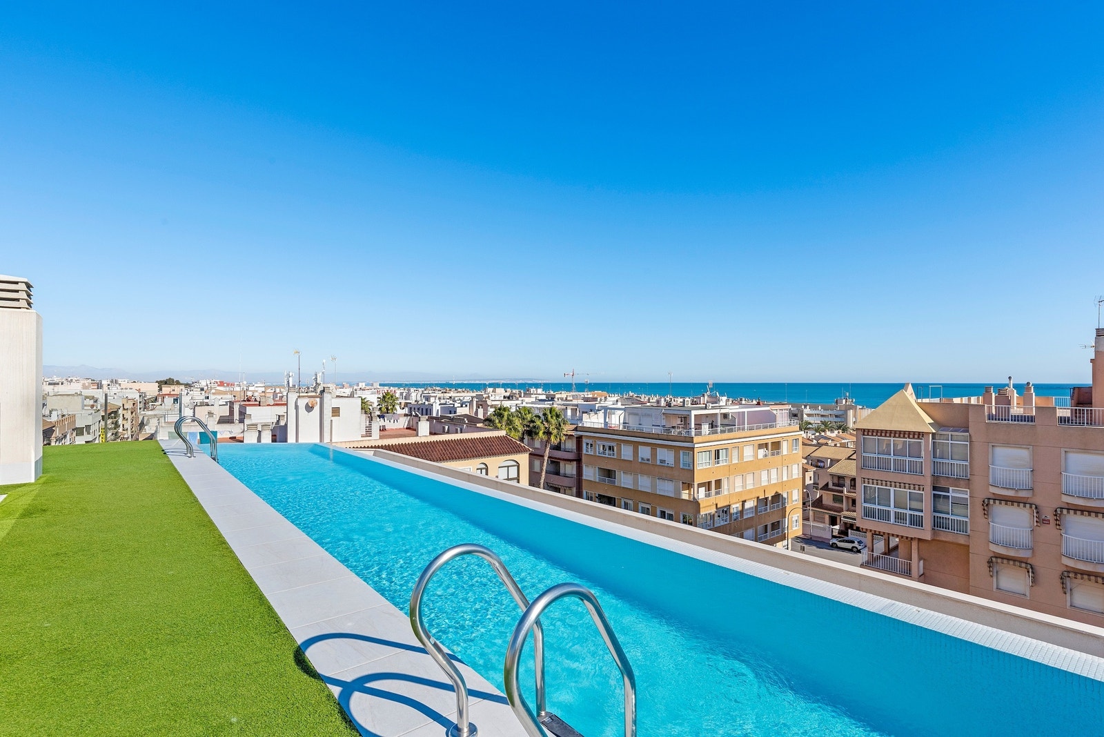 Spania1 har gleden av å presentere denne fantastiske leiligheten som ligger i sentrum av Guardamar. Leiligheten inneholder 2 soverom med innebygde garderober, 2 delikate bad, romslig stue med store vindusflater og flott kjøkken. Leiligheten har også terrasse utenfor stuen i tillegg til at det er stor felles takterrasse med svømmebasseng, treningsrom og toalett. Her kan du nyte solen hele dagen og en fantastisk utsikt over Middelhavet.