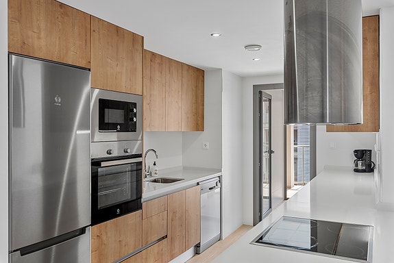 Kjøkkenet har integrerte hvitevarer av høy kvalitet, inkludert stekeovn, platetopp, mikrobølgeovn og oppvaskmaskin.