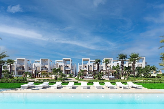 Beliggende kun noen få minutter fra et bredt utvalg av fasiliteter, inkludert supermarkeder, restauranter og butikker, kombinerer dette prosjektet luksus og bekvemmelighet.Her kan man velge mellom leilighet med 2 eller 3 soverom enten på bakkeplan med terrasse og hage eller toppleiligheter med terrasse og takterrasse som har forhåndsinstallasjon for boblebad og utendørs dusj.