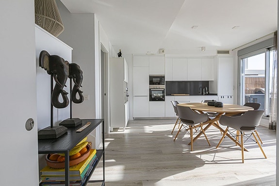Denne lyse og moderne 3-soveroms dupleksen har en åpen kjøkken- og stueløsning med store gulv-til-tak-vinduer som slipper inn rikelig med naturlig lys.