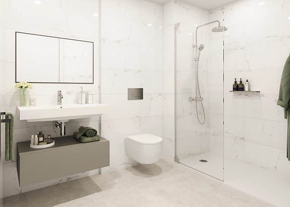 - Bad med møbel, speil, dusjvegger og termostatstyrt dusj (hovedbad)