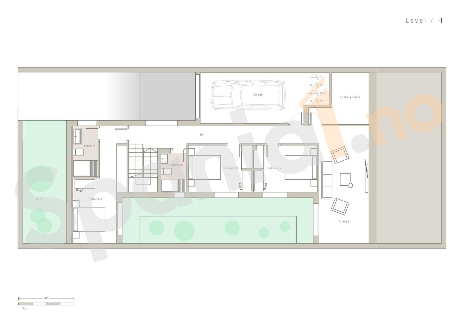 Underetasjen har soverom med et svalt og behagelig inneklima, direkte utgang til hage, samt bod, vaskerom og garasje.