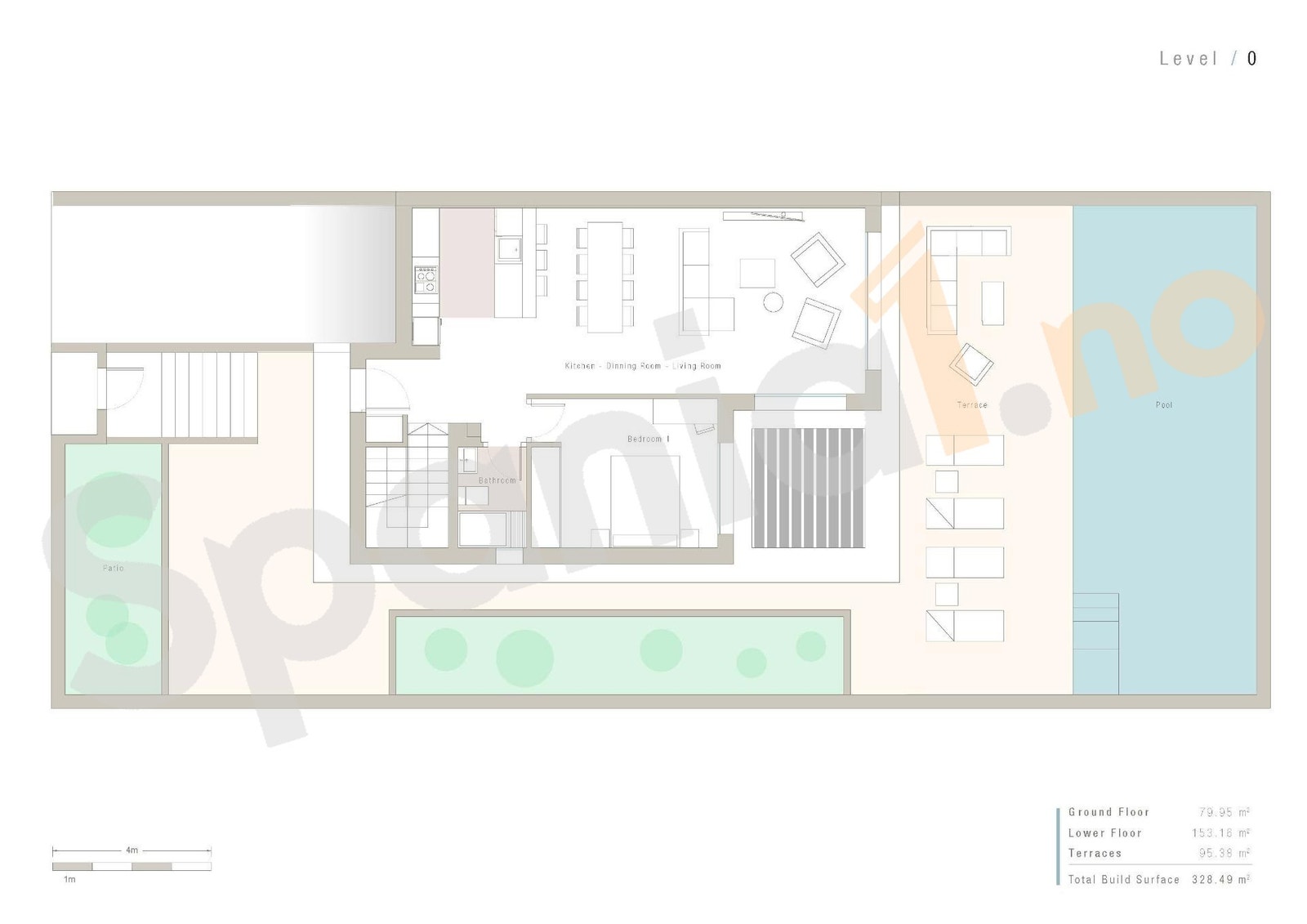 I hovedetasjen finner du en romslig stue og spisestue i åpen løsning mot et moderne kjøkken med integrerte hvitevarer og direkte utgang til terrasse og bassengområde – ideelt for uteliv og sosiale sammenkomster.