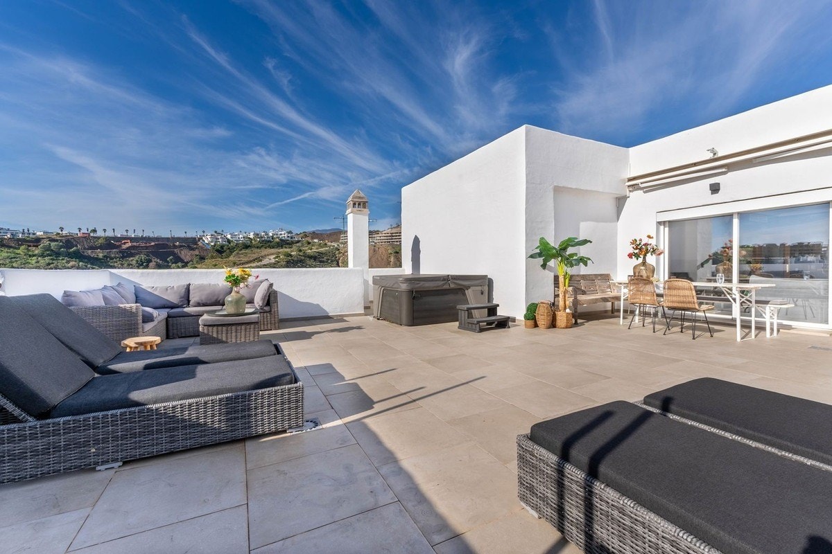 På New Golden Mile i Estepona finner du denne innflytningsklare duplex-penthouse med moderne komfort, store uteplasser og fantastisk utsikt til fjell og landskap.