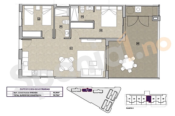 Alle våre meglere er norske. Ingen kjøpepress.Torrevieja en en veletablert og populær kystby som ligger 40 km sør for flyplassen i Alicante. Byen har omlag 83.000 innbyggere og går for å være en av de mest internasjonale byene i Europa. Tidligere var dette en fiskelandsby med stor grad av saltproduksjon. Med sin unike beliggenhet mellom middelhavet og to store saltlaguner har dette området en rekke helsefordeler. Når man bor i Torrevieja er man i kort gangavstand til hvite, langstrakte sandstrender med “blå flagg” stempel, som en indikasjon på blant annet høy vannkvalitet. I nærområdet og gjerne “rett utenfor” døren finner man et stort utvalg av lokale butikker, restauranter, kafeer, kjøpesentre, grønne parker, havnen og promenaden. Hvis man er på jakt etter et område med liv året rundt og et sunt mikroklima med 320 soldager i året, kan dette være noe for deg.Avstand