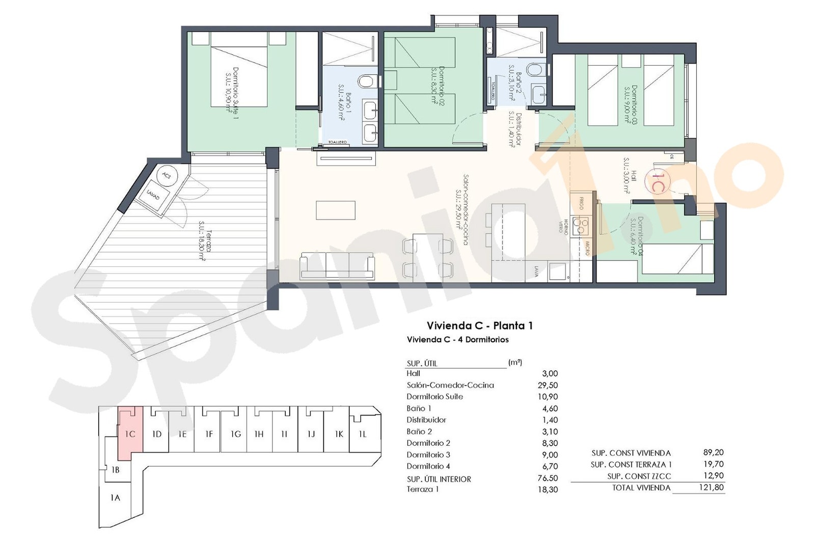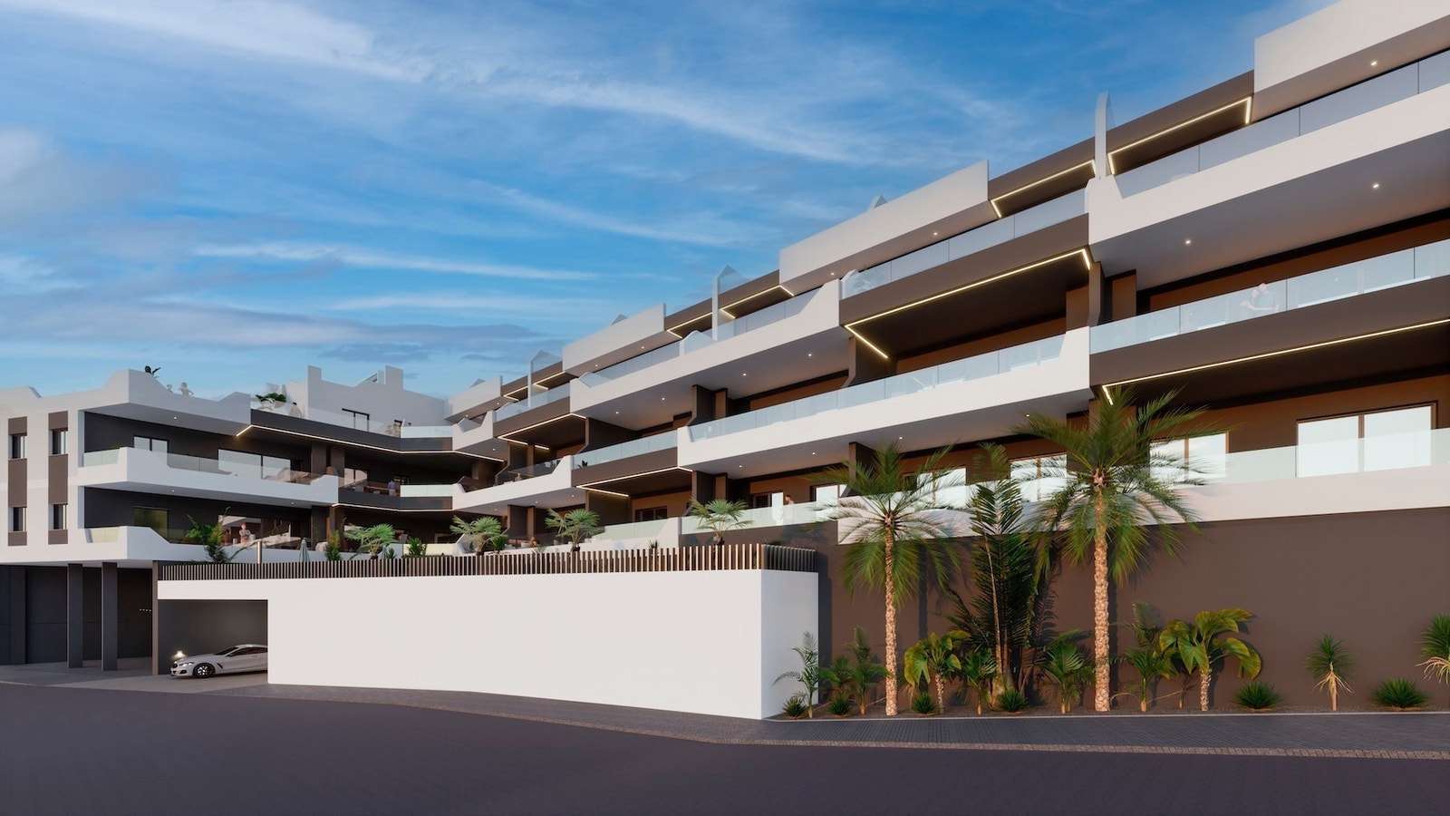 Spania1 har gleden av å presentere et helt nytt leilighetskompleks med 35 leiligheter. Her kan du velge mellom leiligheter på bakkeplan, mellometasje eller toppleilighet. Toppleilighetene har et stort privat solarium med toalett og forhåndsinstallasjon for kjøkken, hvor du kan nyte de vakre sommerdager. I tillegg har prosjektet et stort grøntområde med svømmebasseng for alle eiere, samt parkering og bod for en ekstra kostnad.