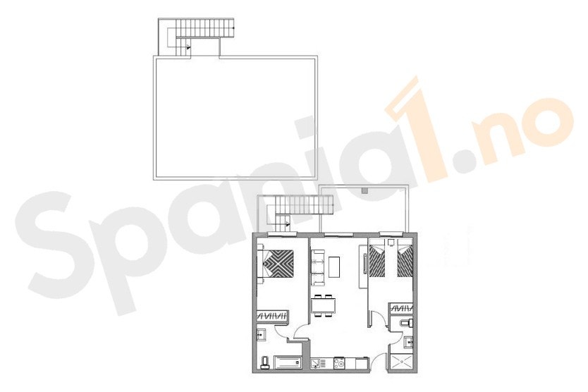 Fra stuen har du direkte utgang til en privat takterrasse på hele 65 m², ideell for soling, grilling eller hyggelige kvelder med familie og venner.