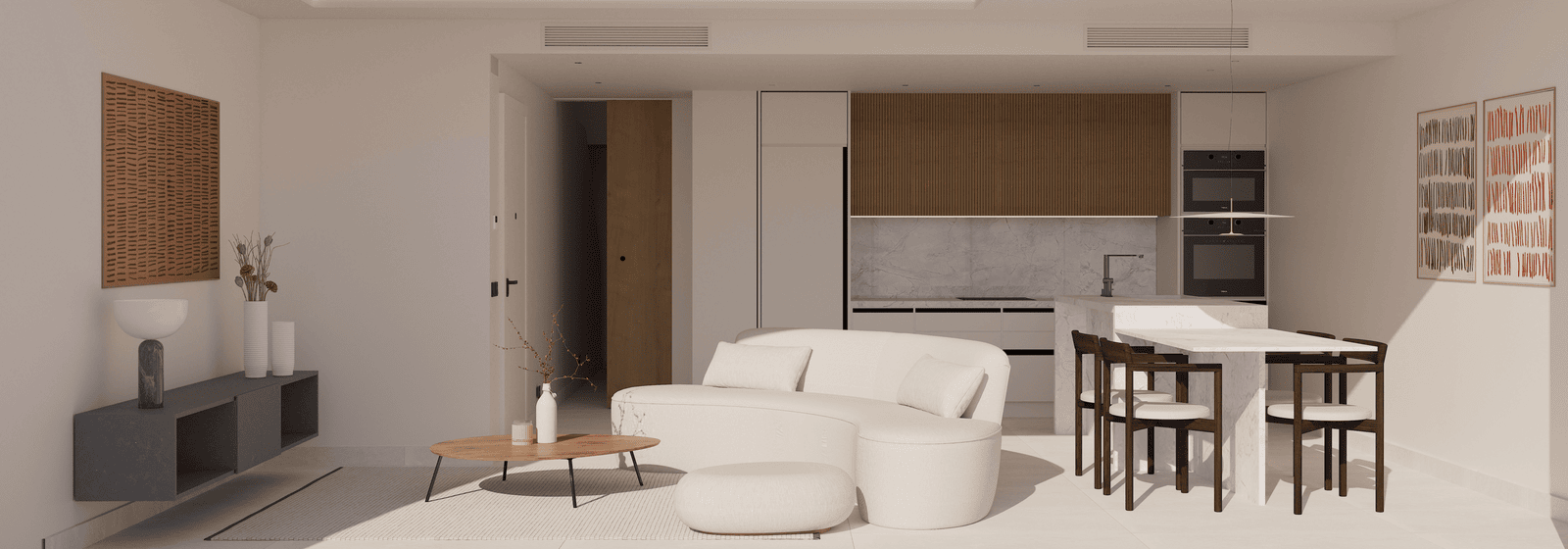 Prosjektet kombinerer elegant middelhavsarkitektur med moderne linjer og er utviklet i henhold til Passivhaus-standarden, som sikrer bærekraftig bygging, høy energieffektivitet og optimal termisk komfort året rundt. Resultatet er boliger som reduserer energiforbruket og samtidig gir et sunt og behagelig inneklima. Boligene kjennetegnes av romslige planløsninger, store vindusflater og førsteklasses materialvalg – en harmonisk balanse mellom design, funksjon og komfort.