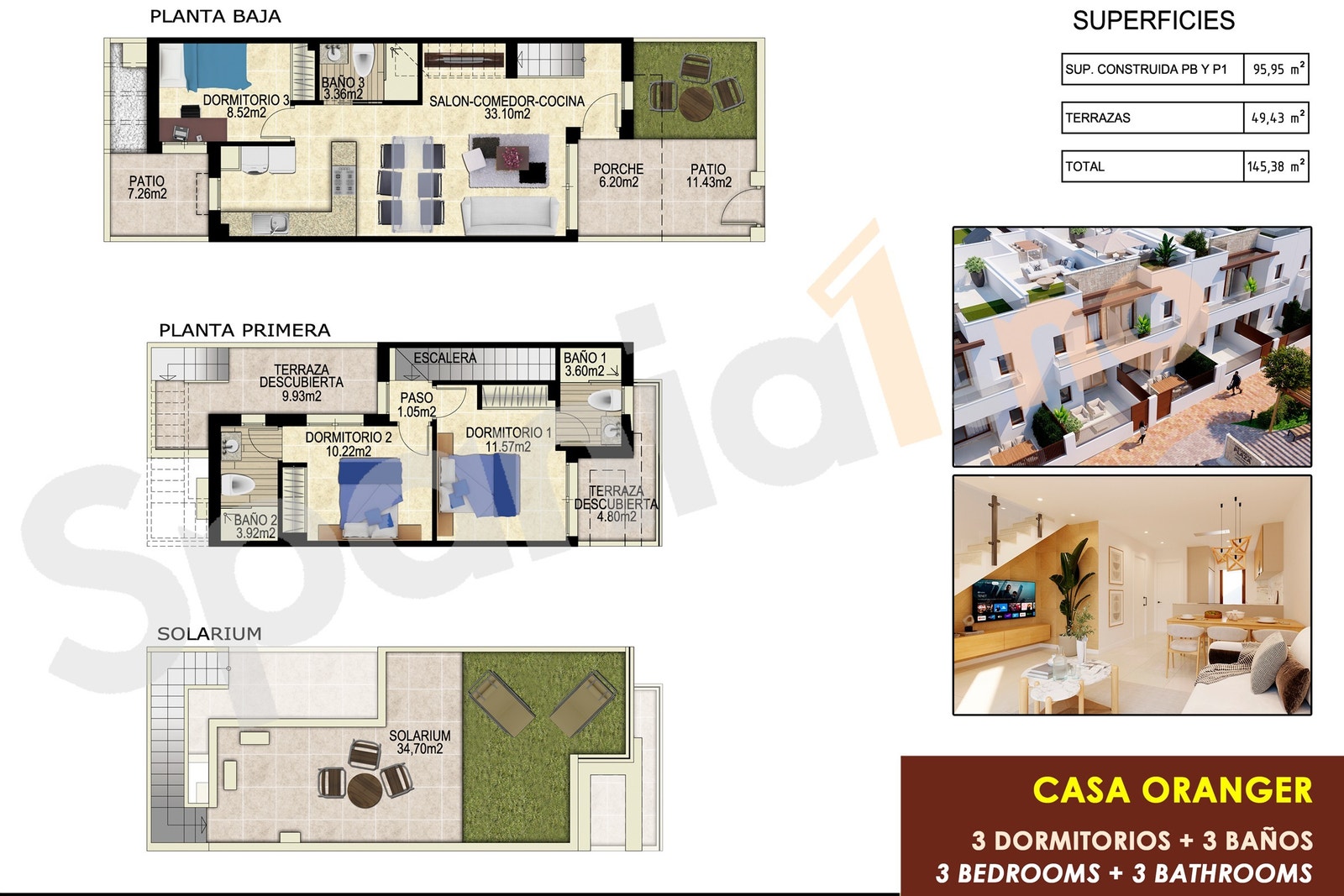 Casa Oranger er en ny modell i den populære urbanisasjonen Vistabella Golf. Boligene leveres med 3 soverom, 3 bad (2 en-suite), flere terrasser og en stor privat takterrasse. Hver enhet har privat hage og egen parkeringsplass, samt tilgang til et stort fellesområde med basseng, grøntområder, lekeplass og sitteområder med pergola og fontene.