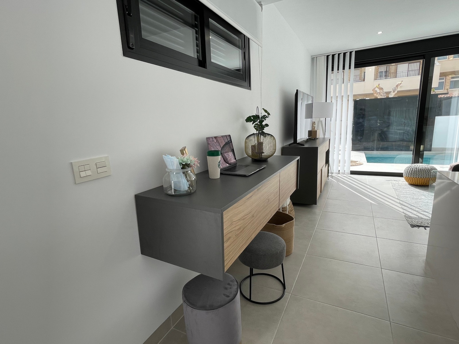 Innvendig består eiendommen av tre soverom og to bad, med åpen og lys stue/kjøkkenløsning med direkte utgang til terrasse og bassengområde. Store glassflater gir rikelig med naturlig lys og en moderne romfølelse. Boligen leveres møblert og med integrert klimaanlegg installert.