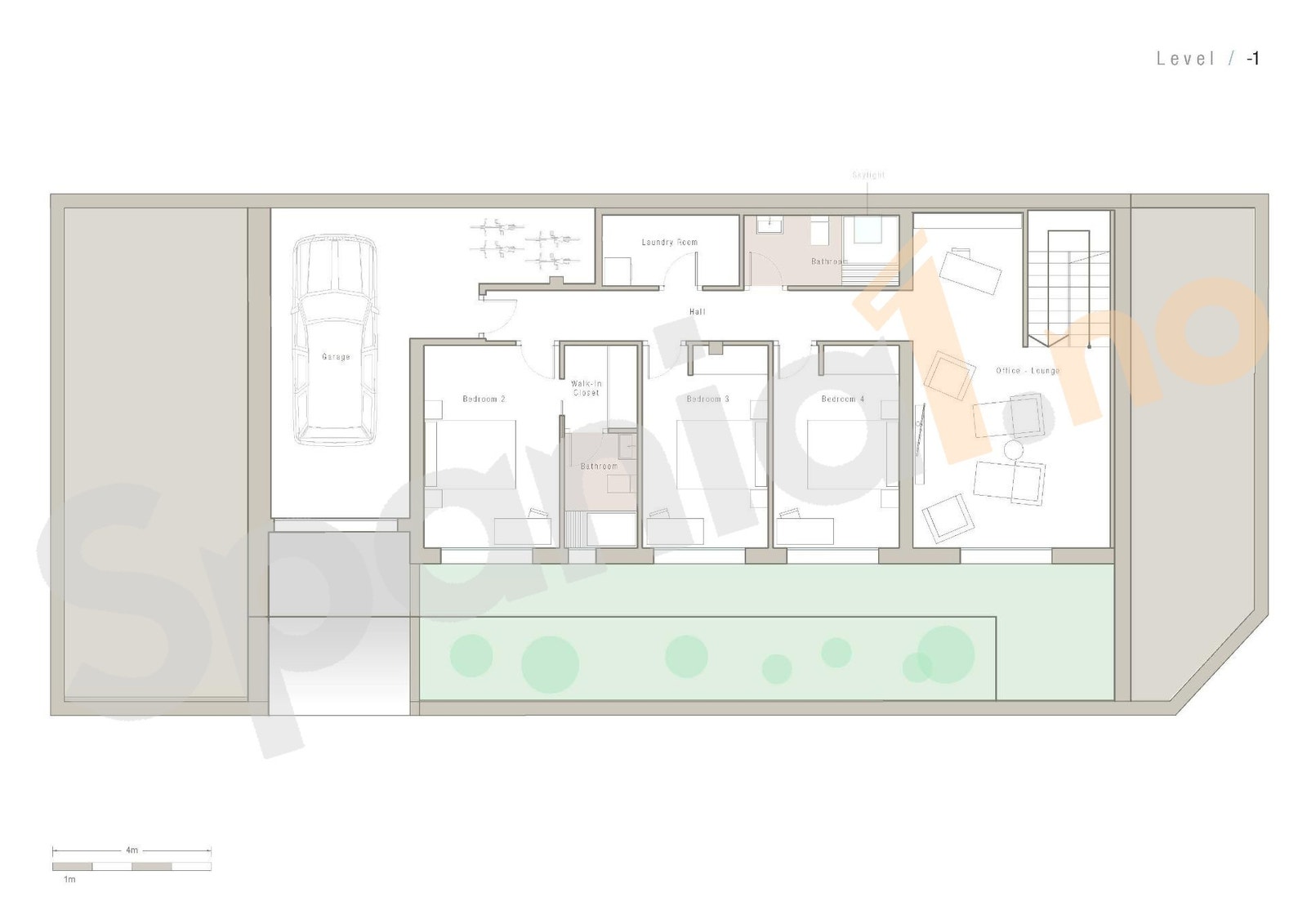 Underetasjen har soverom med et svalt og behagelig inneklima, direkte utgang til hage, samt bod, vaskerom og garasje.