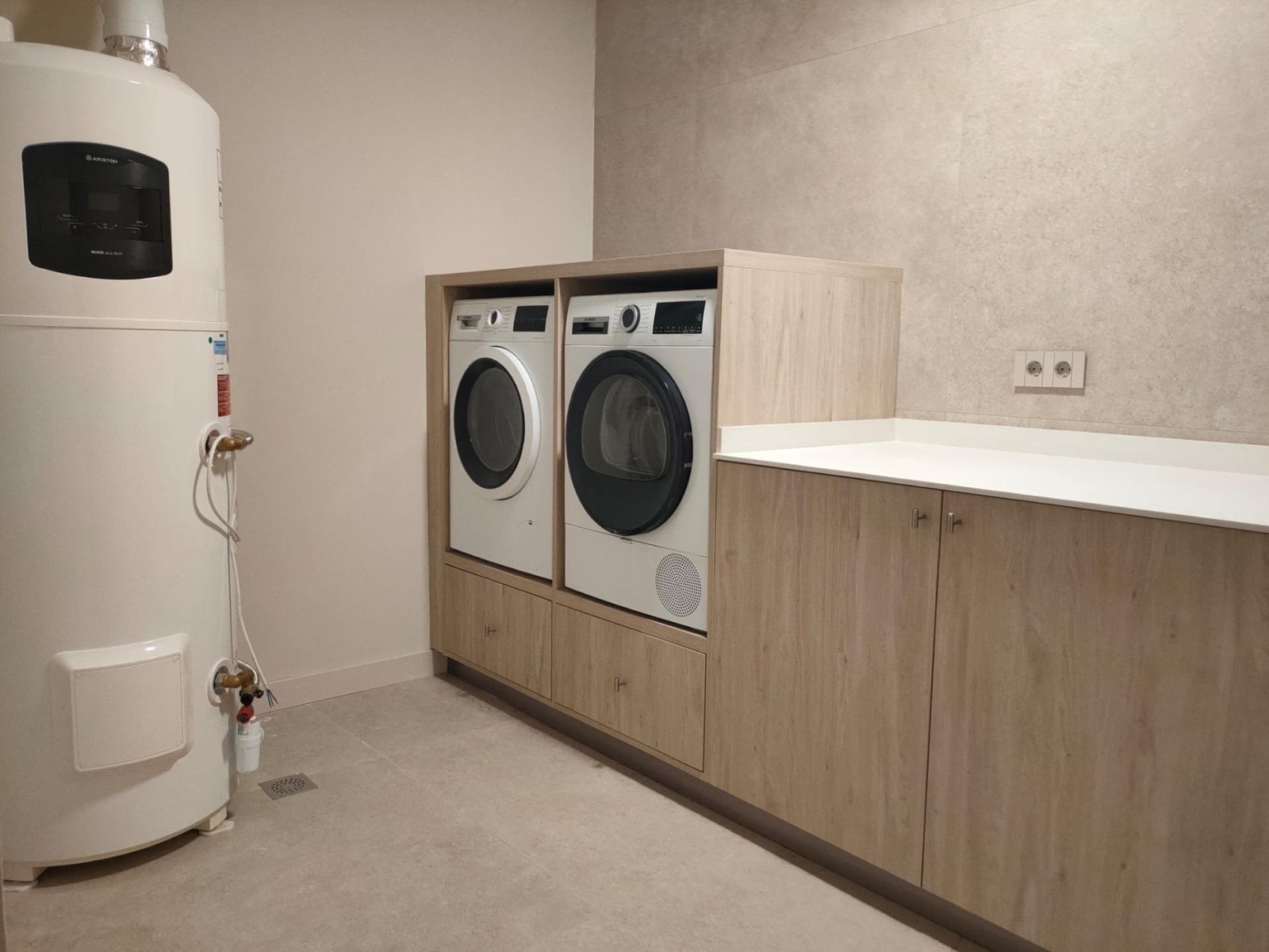 I hovedetasjen finner du en romslig stue og spisestue i åpen løsning mot et moderne kjøkken med integrerte hvitevarer og direkte utgang til terrasse og bassengområde – ideelt for uteliv og sosiale sammenkomster.