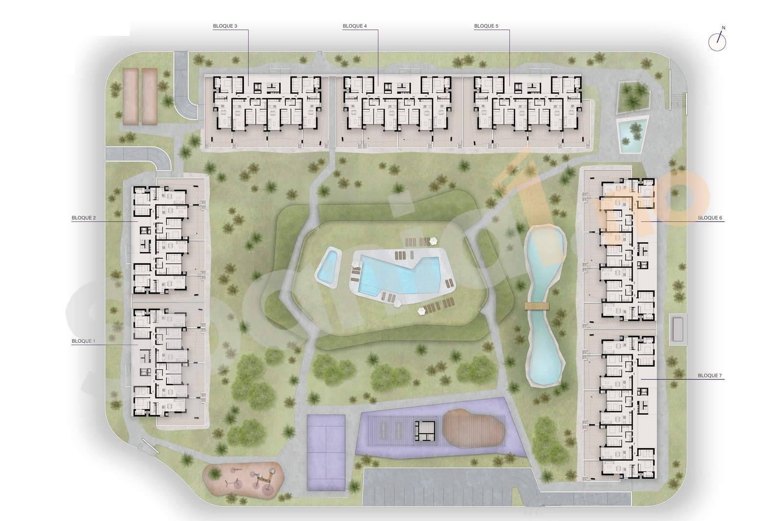 Leilighetene er fordelt på 7 lave blokker rundt et flott fellesområde med basseng for voksne og barn, hager, grillplass, lekepark, padelbane og petanca.