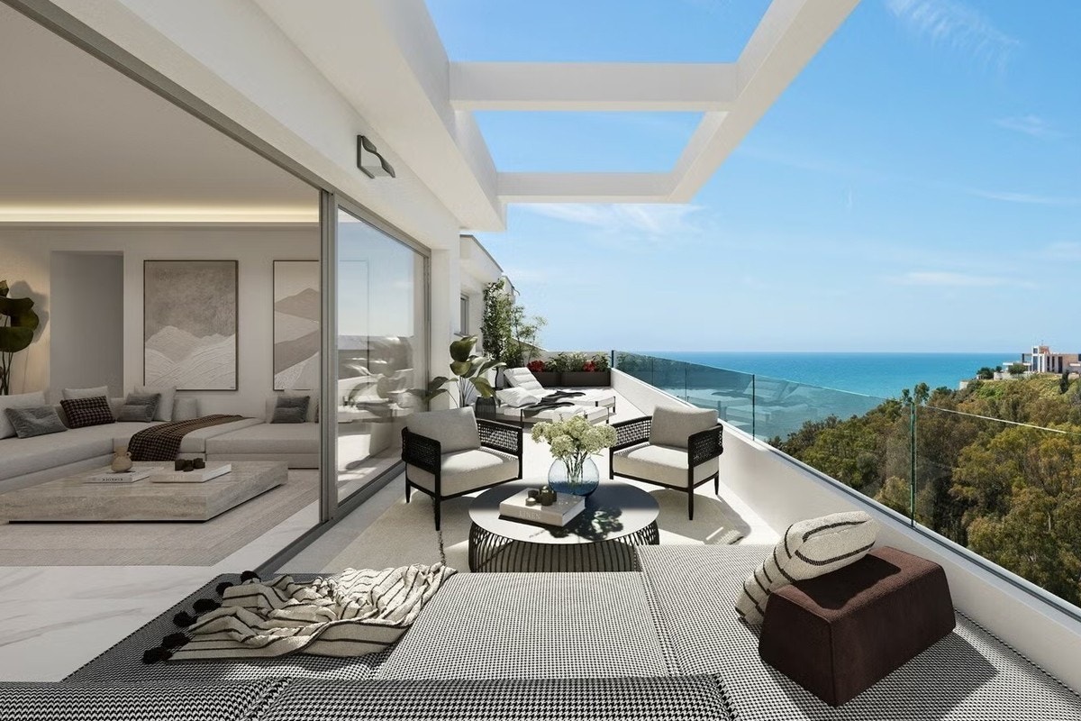 Romslige terrasser gir utsikt over havet, og hver bolig har to parkeringsplasser og bod. Kun 300 meter fra stranden i Benalmádena Costa.