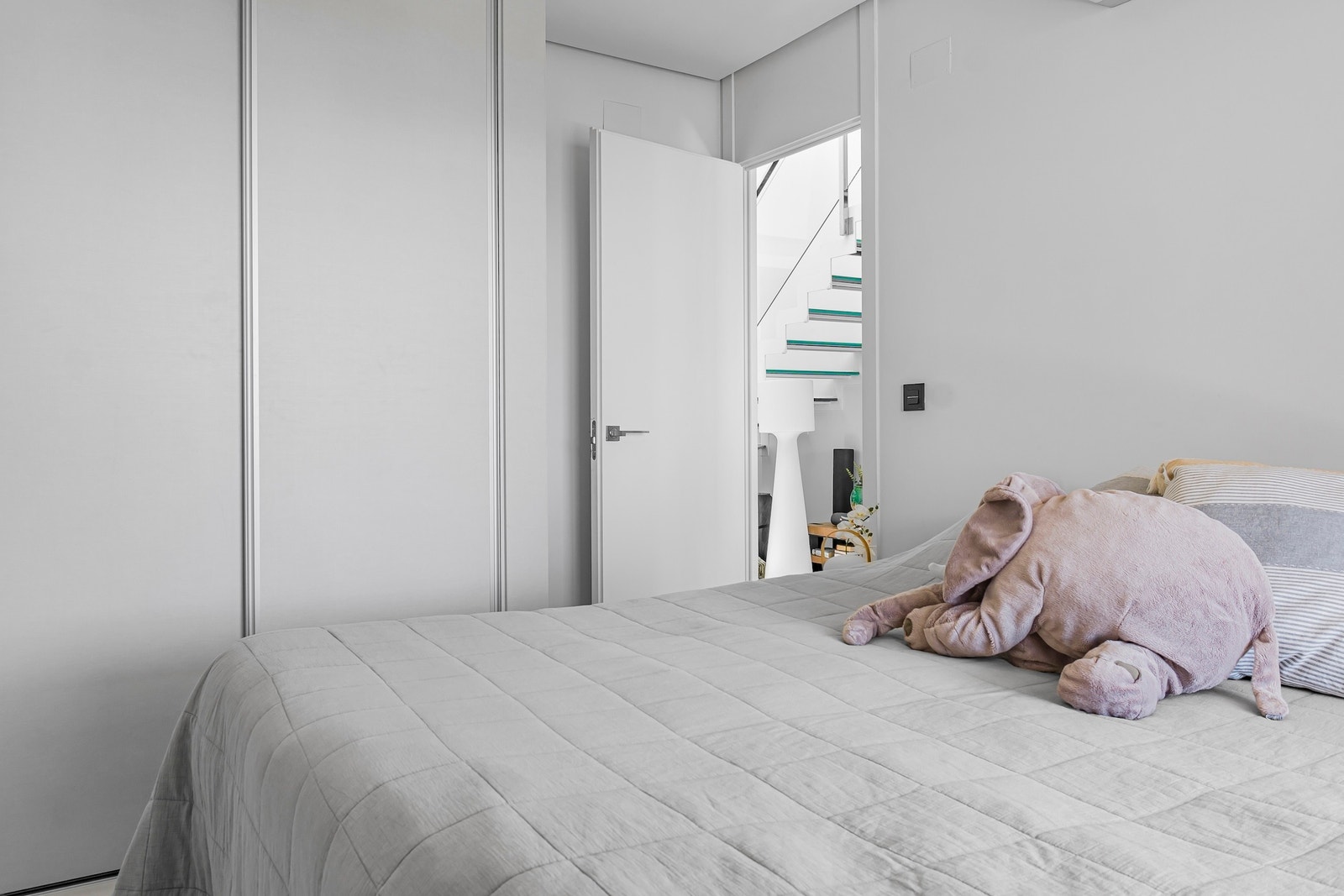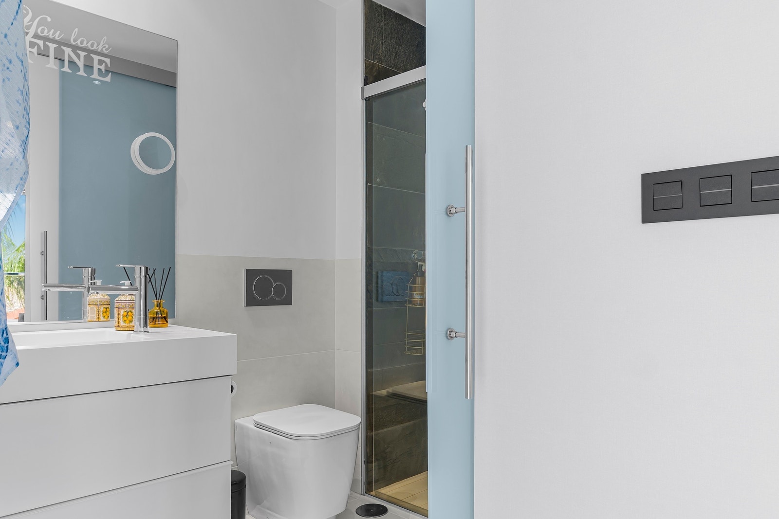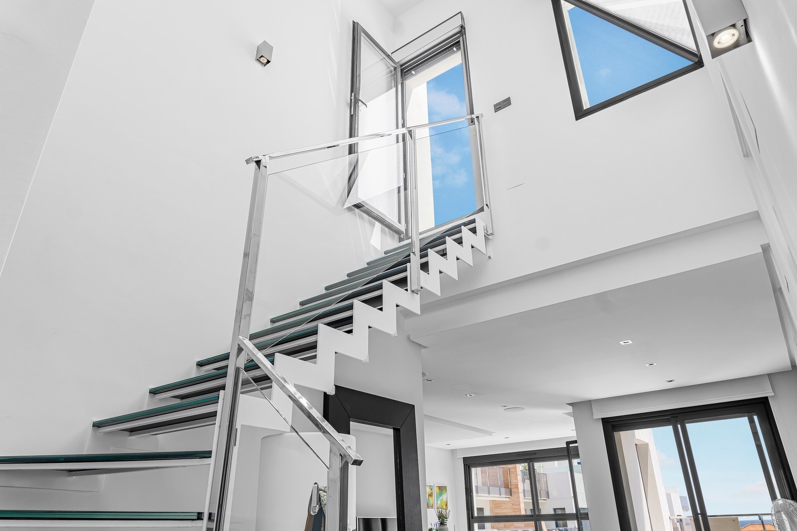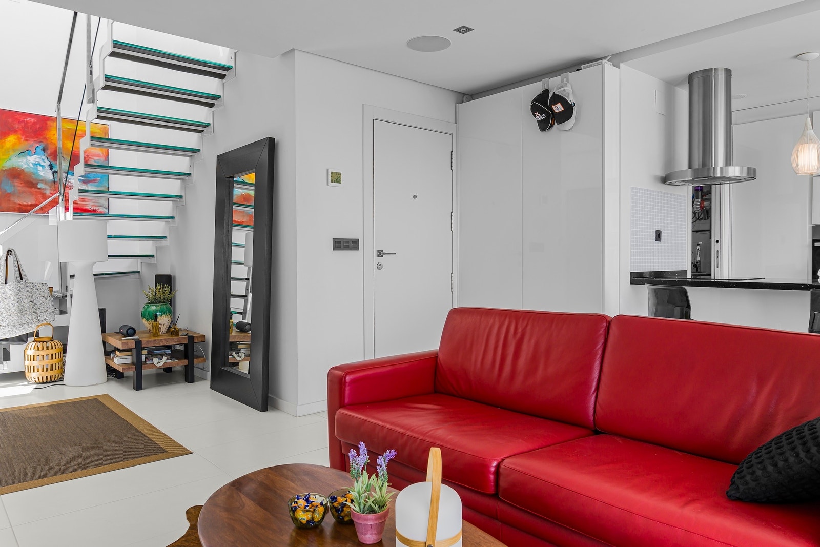 Leiligheten har 3 soverom og 2 bad, en lys stue med store vindusflater og en åpen kjøkkenløsning. Fra stuen er det utgang til privat balkong. En intern trapp fører videre opp til en stor takterrasse med panoramautsikt mot havet – et perfekt sted for sol, avkobling og måltider utendørs.