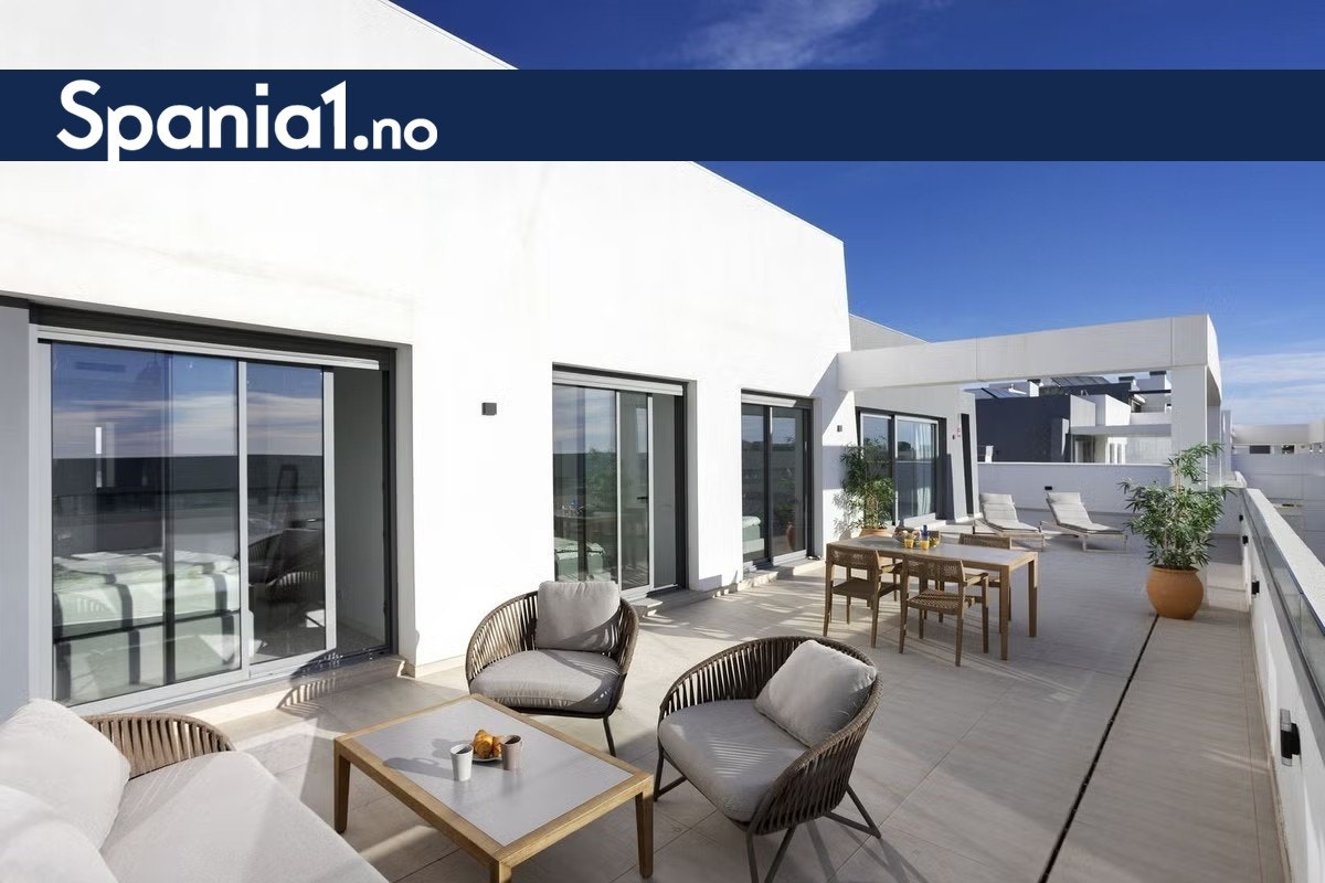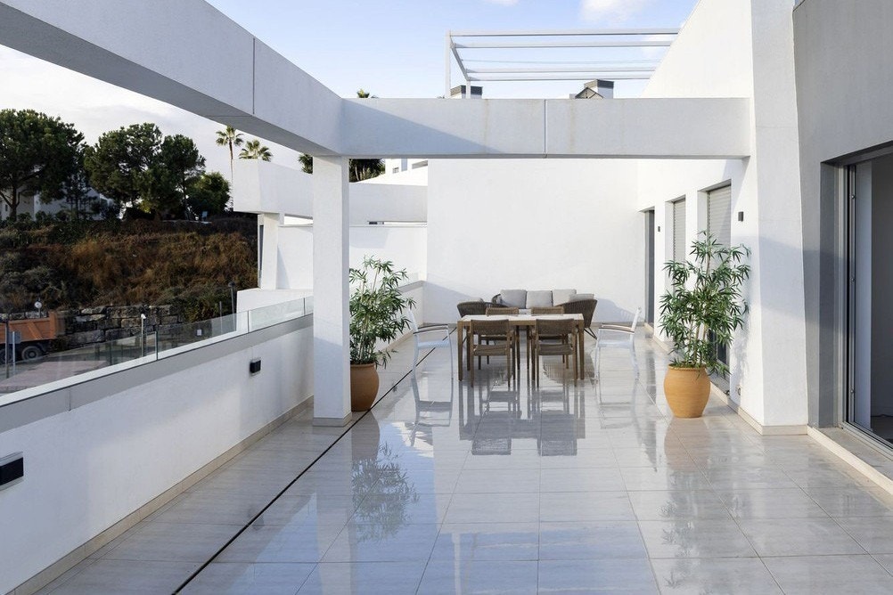 Moderne penthouse på New Golden Mile mellom Marbella og Estepona. Leiligheten ligger i et etablert anlegg fra 2019 med flotte fellesområder, basseng og høy sikkerhet. Her får du romslige terrasser med havutsikt, nærhet til golfbaner, strand, butikker og alle servicetilbud.