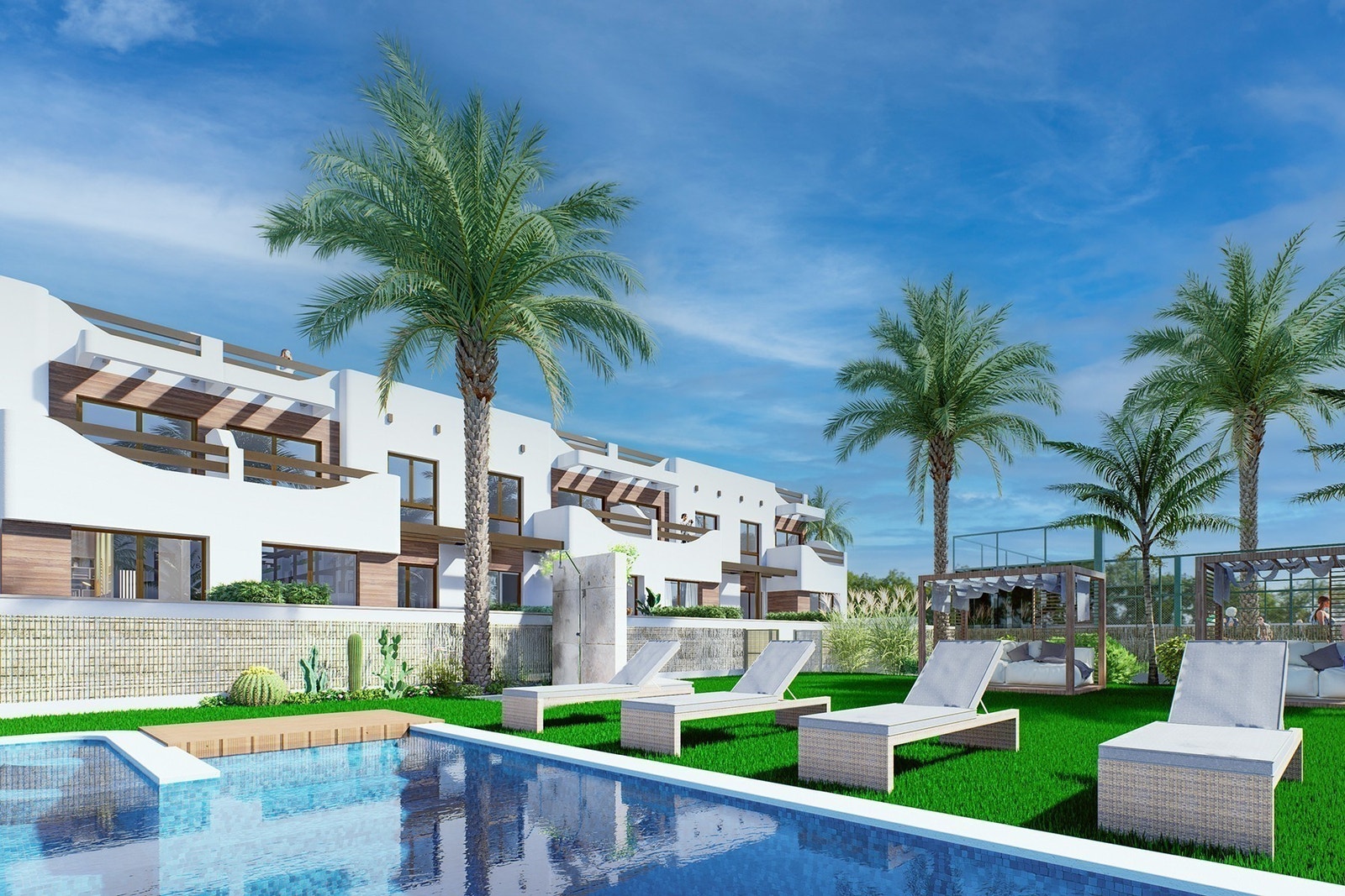 Spania1 har gleden av å presentere moderne boliger kun få skritt fra stranden Las Higuericas i Torre de la Horadada. Her kan du velge mellom bungalower i første etasje med privat hage eller toppleiligheter med romslige solterrasser. Hver bolig med 2 soverom er designet med et moderne og funksjonelt uttrykk.