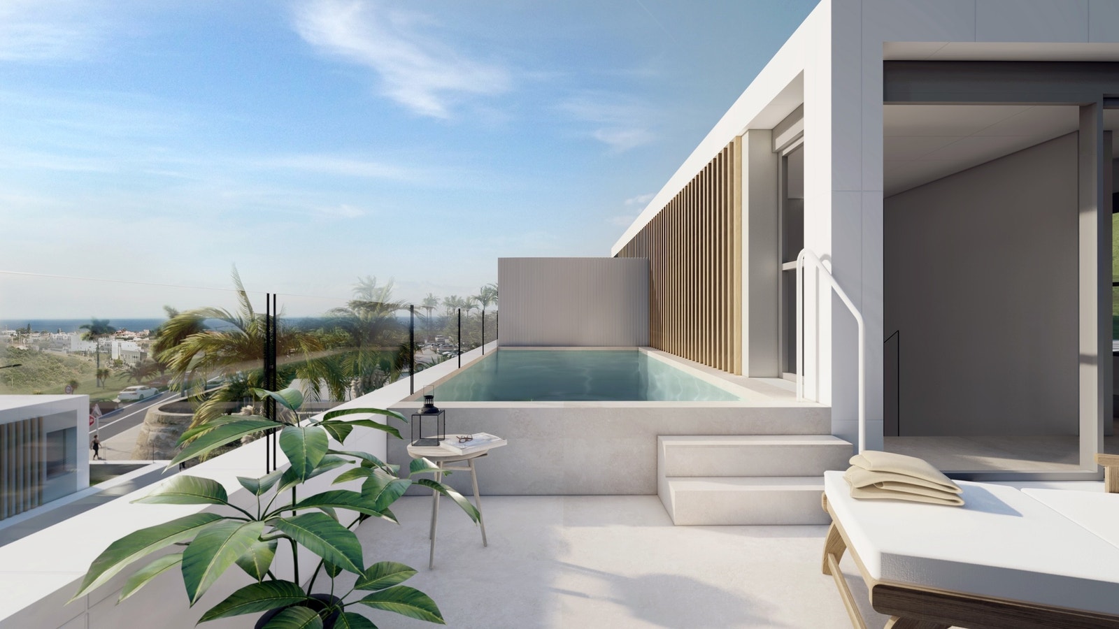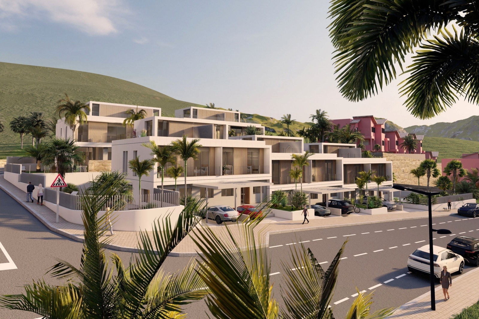 Ende-enhetene har privat hage med eget saltvannsbasseng, mens midt-enhetene har basseng på takterrassen – et ideelt sted for å nyte utsikten over området. Fasadene kombinerer hvite flater med mørk naturstein og detaljer i treimitasjon, et uttrykk som gir varme, dybde og minimalt vedlikehold. Innvendig leveres boligene med store porselensfliser i 90×90-format, moderne baderom med vegghengte toaletter, dusjvegger i glass og LED-speil, samt vinduer og dører i høykvalitets aluminium med elektriske persienner. Kjøkkenet er fullt utstyrt med hvitevarer fra Siemens eller tilsvarende, og benkeplater i Silestone/Dekton. Soverommene har garderober med innredning, og hovedsoverommet har walk-in løsning.
