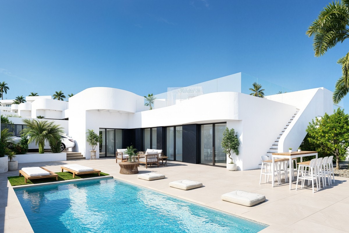 Villaene har en tydelig Ibiza-inspirert arkitektur, med myke linjer, lyse fasader og et uttrykk som harmonerer godt med omgivelsene. Uteområdene er romslige og funksjonelle, tilrettelagt for helårsbruk med gode solforhold og privatliv – ideelt for både avslapning og sosiale sammenkomster i rolige omgivelser.