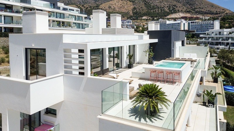 Leiligheten har romslige utearealer, inkludert stor terrasse og privat plunge pool med utsikt mot Middelhavet. Planløsningen er gjennomført og funksjonell, med åpen stue- og kjøkkenløsning og sømløs overgang mellom inne- og utearealer. Elektriske markiser og solskjerming gir komfort hele året, og gulvvarme i alle rom sørger for behagelig inneklima også vinterstid