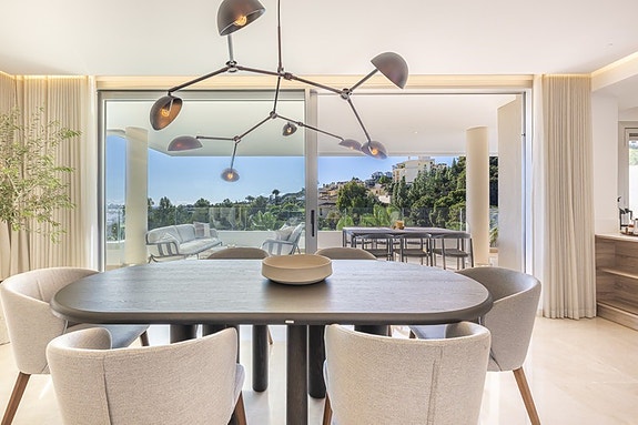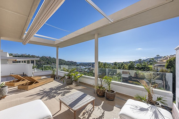 Denne penthouse duplex-leiligheten ligger i et eksklusivt og lukket boligområde i La Reserva del Alcuzcuz, omgitt av natur og med åpen 180 utsikt mot dal, fjell og Middelhavet. Beliggenheten gir en rolig og privat atmosfære samtidig som det er kort kjøreavstand til kysten og byene langs Costa del Sol.