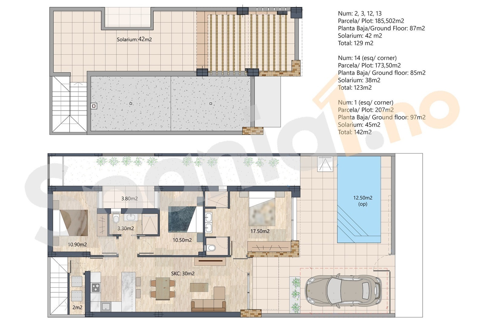 Spania1 presenterer et flott prosjekt med moderne frittstående villa med 3 soverom, 2 bad, en åpen stue og kjøkkenløsning – alt på ett plan
