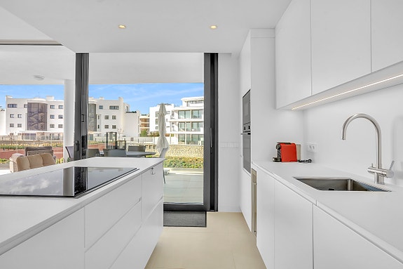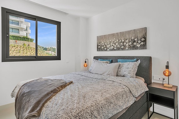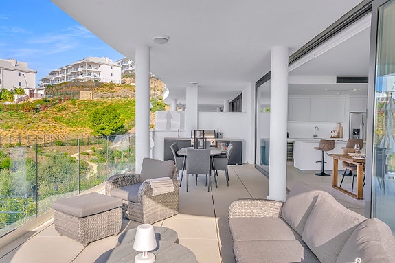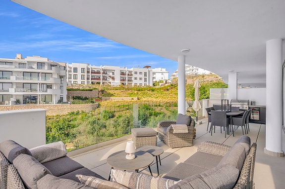Leiligheten har sørvestvendt orientering som gir gode solforhold gjennom dagen og flott ettermiddagssol. Terrassen er overbygget, noe som gir både skygge på varme dager og mulighet for bruk året rundt. Beliggenheten er godt skjermet for vær og vind, samtidig som utsikten er åpen og varig. Fra boligen er det kort gangavstand til Higuerón Resort med hotell, spa, treningssenter og restauranter.