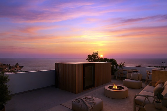 Fra takterrassen er det panoramautsikt mot kysten og havet. Enkelte boliger har også et ekstra rom på takterrassen som kan benyttes som hjemmekontor eller oppholdsrom.