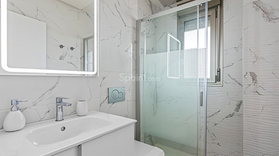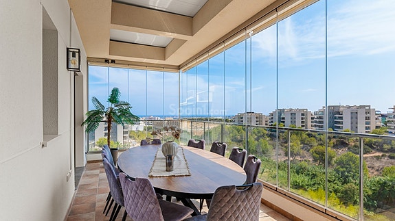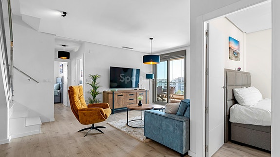 Vi har gleden av å presentere en av de flotteste leilighetene i det populære boligkomplekset Green Hills – beliggende like ovenfor La Zenia. Dette er en sørvestvendt toppleilighet (penthouse) med 3 soverom, 2 delikate bad med gulvvarme, en stor innglasset terrasse utenfor stuen, samt en privat takterrasse (takterrasse) med pergola og utedusj. Herfra har man vakker utsikt over grøntområder og Middelhavet.