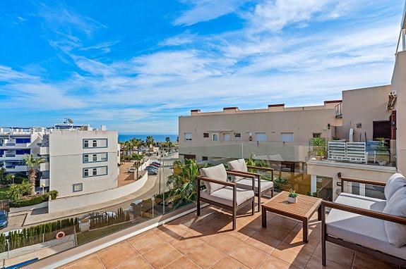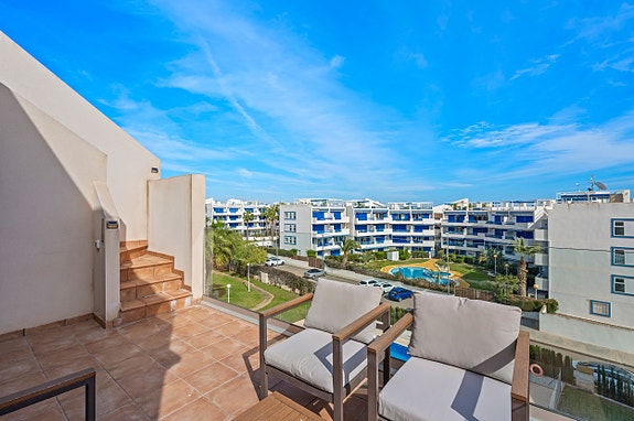 Velholdt toppleilighet i populære Playa Flamenca, kun ca. 500 meter fra stranden. Her bor du med kort gangavstand til restauranter, butikker og øvrige servicetilbud.