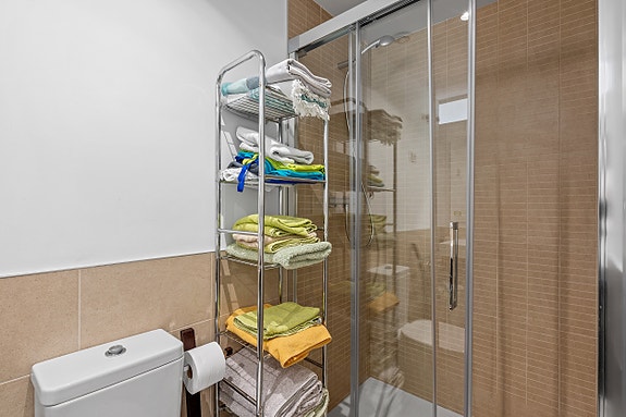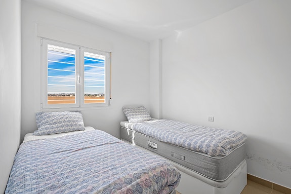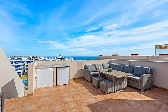 Boligen har 2 soverom og 2 bad, hvorav hovedsoverommet har eget bad. Stue og hovedsoverom har direkte utgang til en romslig terrasse med fin utsikt mot Middelhavet. I tillegg har boligen en ekstra, mer skjermet terrasse fra kjøkkenet, samt eget vaskerom.Takterrassen er et av høydepunktene i boligen, med god plass til utemøbler, solsenger og hyggelige oppholdssoner, samt flott panoramautsikt mot havet.