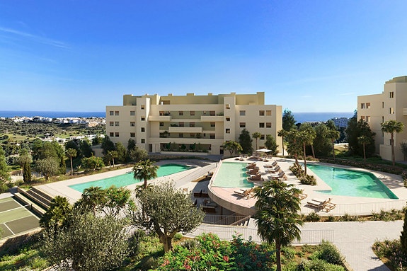 Moderne leiligheter med hav- eller golfutsikt - Stor terrasse og fellesområde med basseng, gym og coworking
