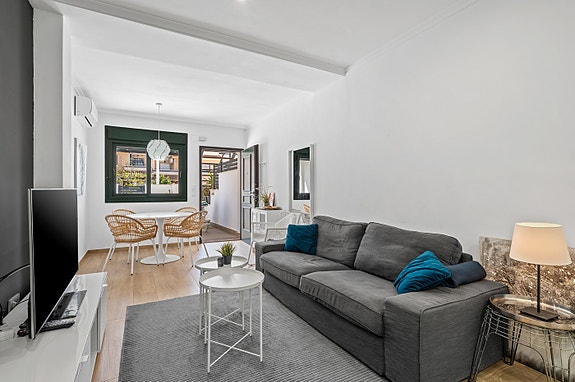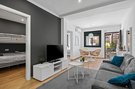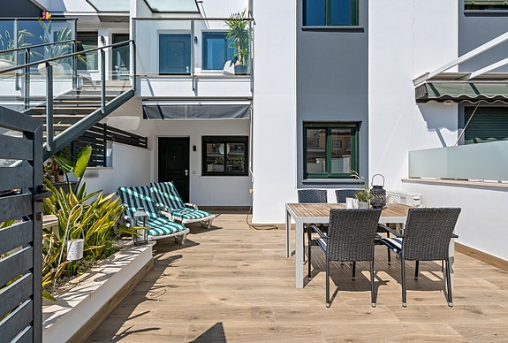 I hjertet av boligen er en stilig åpen stue og spisestue med et moderne kjøkken, noe som skaper en romslig og innbydende atmosfære. Fra stuen har du direkte tilgang til en stor terrasse foran, perfekt for utendørs servering, avslapning eller å nyte middelhavsklimaet.