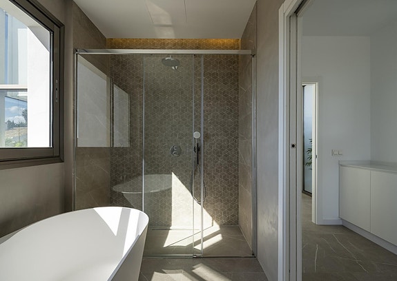 - Andre etasje: Hovedsoverom med eget bad og badekar, samt utgang til privat terrasse. To ekstra soverom, bad og solrike terrasser – flere med utsikt mot havet.