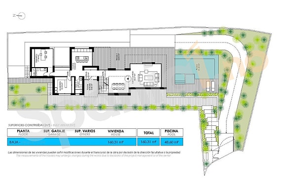 - Hovedplan: Romslig stue/spisestue med åpen kjøkkenløsning, ett soverom/kontor og bad. Direkte utgang til terrasse, hage og basseng.