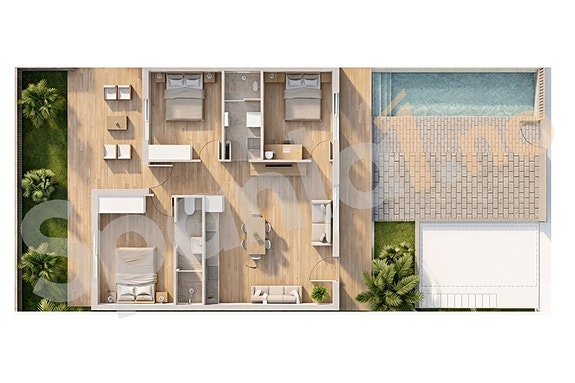 Boliger på bakkeplan leveres med privat hage, terrasse og eget basseng, og har en praktisk planløsning med direkte utgang til uteområdet. Dette gir gode muligheter for å nyte uteplassen året rundt.