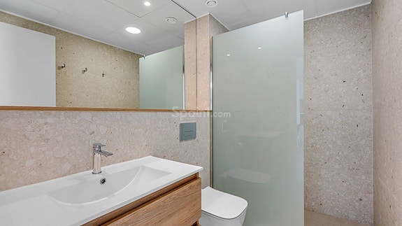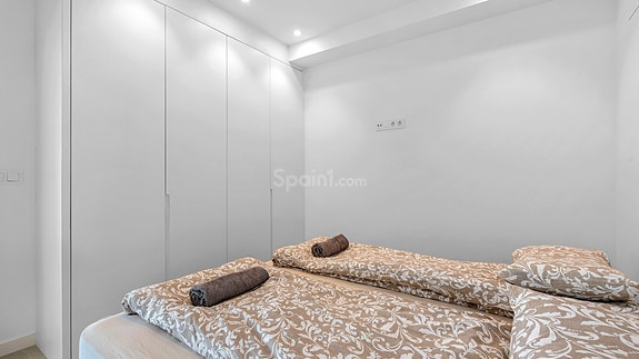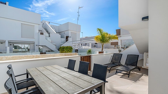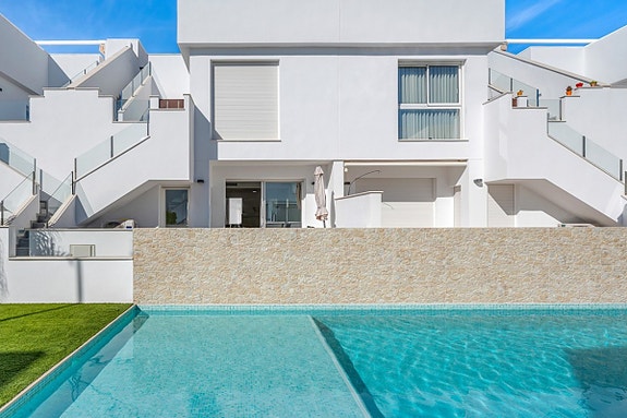 Fra stuen er det utgang til en romslig bakterrasse med direkte adkomst til fellesområdet med svømmebasseng.Boligen ligger i et etablert og attraktivt område i Pilar de la Horadada, med kort vei til strand, servicetilbud og daglige fasiliteter. Kystlinjen byr på flere sandstrender og mindre bukter, og området har gode helårsfasiliteter.