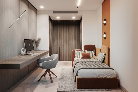 På bakkeplan finner du stue og kjøkken i åpen løsning med direkte utgang til terrasse og eventuell hage. I etasjen over ligger soveromsavdelingen med tre soverom og to bad. Øverst har boligene en romslig takterrasse med god plass til utemøbler, og mulighet for både jacuzzi og utekjøkken.