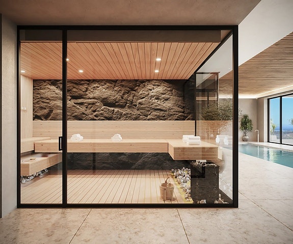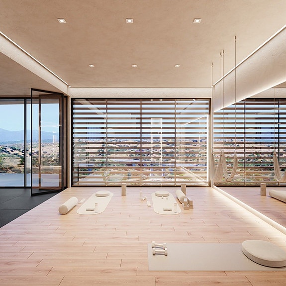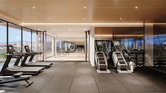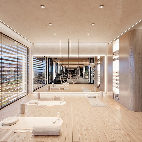 Fellesområdet er utviklet med fokus på velvære og aktivitet, og inkluderer både innendørs og utendørs oppvarmede basseng, treningsrom, spa-avdeling med badstue og hammam, samt flere uteområder for trening og avslapning.